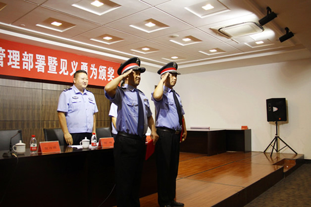 會上,乾通物業代表應邀發言,著重介紹了保安管理經驗、見義勇為事件過程以及與公安部門日常工作對接情況。趙峰大隊長代表崇川公安分局及區見義勇為基金會宣讀了對乾通物業曹福如和張書華見義勇為的表彰決定,并為二人頒發了見義勇為證書及獎金。同時,號召與會的物業公司及保安公司深入學習這種見義勇為的精神。