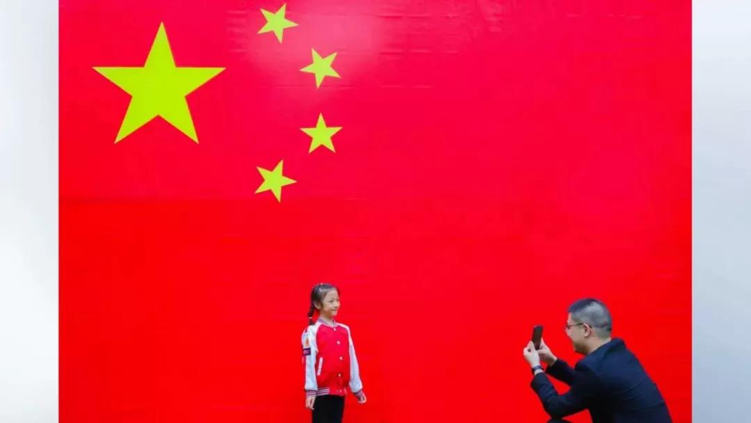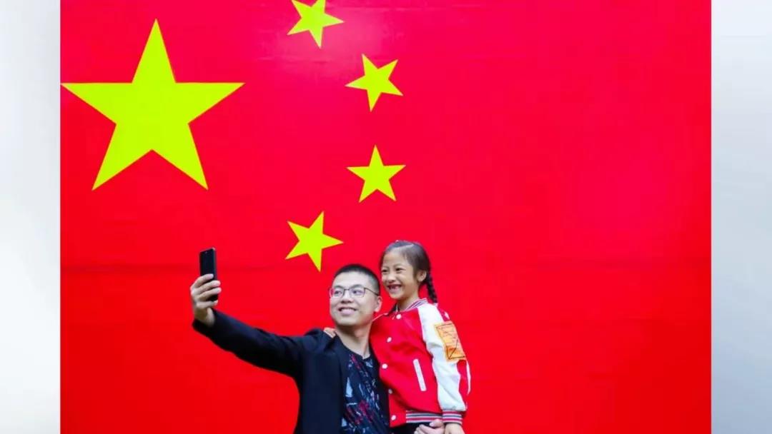 在水繪園風景區,他們看到了一幅巨大的五星紅旗。周啟明拿出手機,拍下自己和女兒與國旗合影的畫面,讓孩子接受愛國主義教育。這時,正好碰上了攝影師徐慧,拍下了這幅幸福溫馨的照片。