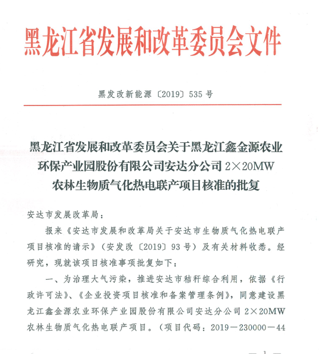近日,黑龍江省發改委發布了《黑龍江省發展和改革委員會關于黑龍江鑫金源農業環保產業園股份有限公司安達分公司2×20MW農林生物質氣化熱電聯產項目核準的批復》(黑發改新能源【2019】535號),安達2×20MW農林生物質氣化熱電聯產項目通過核準。目前黑龍江鑫金源農業環保產業園股份有限公司安達分公司已與升平鎮和火石山鄉簽約建設秸稈收儲壓塊站,熱電聯產項目也落座安達市萬寶山精細化學品產業園區。