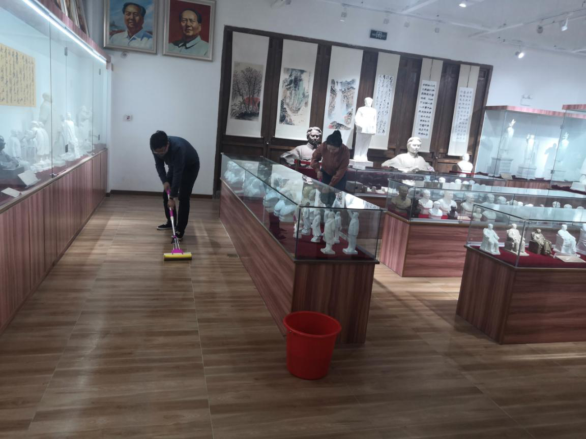 黨員們首先來到毛主席塑像收藏紀念館參觀學習。紀念館展示了上世紀五十年代初至七十年代末全國各地制作的毛主席塑像及瓷板畫、瓷擺件等各類藝術品,這些塑像品種繁多、質(zhì)地精美,惟妙惟肖地刻畫出偉人的精氣神。通過工作人員的介紹,黨員們了解了不同時期、不同造型毛主席塑像的故事和意義,也通過這些塑像更加深入地學習了黨史和新中國史。 塑像紀念館面積600平方米,藏品達6500件,由館主沈愛國老夫妻倆管理。他們每天都要接待前來參觀學習的黨員群眾,近期不少單位在此開展主題活動,他們倆就更忙了,每天僅打掃衛(wèi)生就很不容易。國盛環(huán)境黨支部了解這一情況后,主動組織黨員帶著拖把、水桶、抹布等到塑像館開展志愿服務。黨員們有的打水,有的拖地,有的擦拭玻璃展柜,大家行動迅速、認真細致、井然有序。國盛環(huán)境黨支部也與沈愛國老人約定,今后館里有什么困難,可以隨時聯(lián)系國盛環(huán)境黨支部幫助解決。