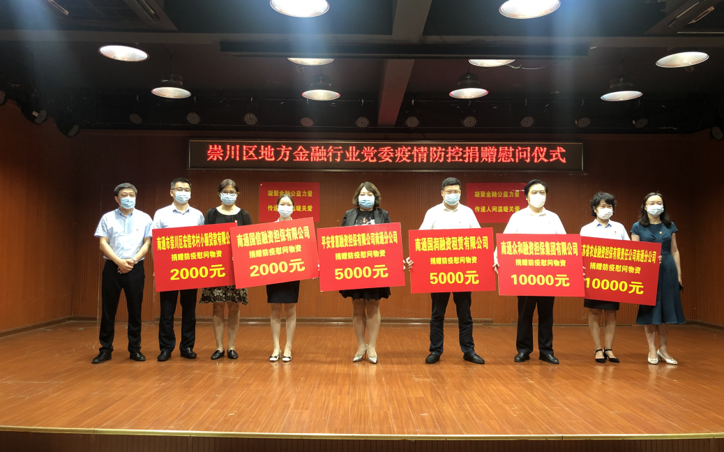 8月13日下午,崇川區地方金融行業黨委組織召開疫情防控捐贈慰問儀式。區政府分管副區長、區委組織部副部長、“兩新”工委書記梁海燕,崇川區副區長徐煒,區金融監管局局長、區地方金融行業黨委書記耿擁軍參加會議。眾和擔保黨支部書記何葉代表公司向抗疫一線社區捐贈壹萬元防疫物資,用于支持區域內街道、社區的防疫工作開展。