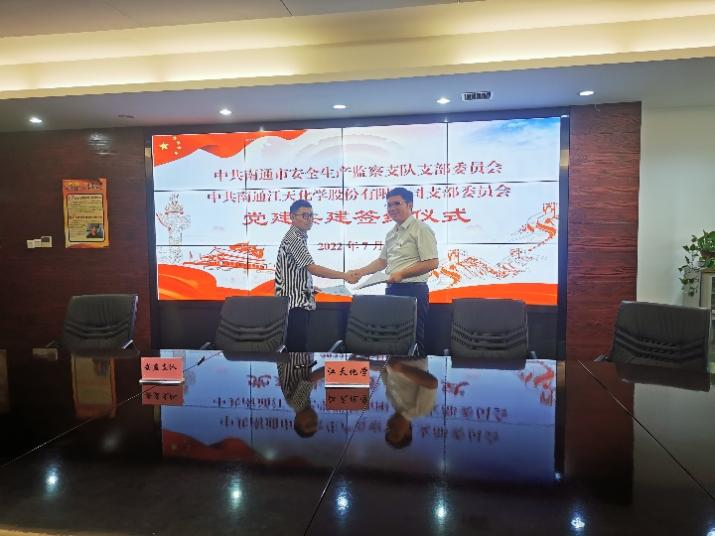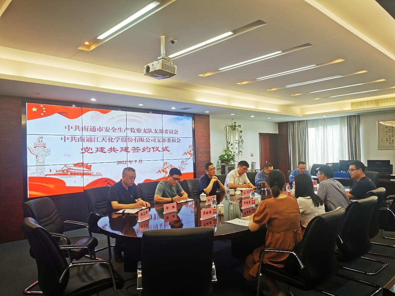 為認真貫徹落實習近平總書記關(guān)于安全生產(chǎn)方面的重要論述,深化“紅色引領(lǐng) 綠色智造”黨建品牌建設(shè),深入推進融合黨建實踐,提升安全生產(chǎn)管理工作成效。7月份,江天化學黨支部與南通市安全生產(chǎn)監(jiān)察支隊黨支部開展了黨建共建簽約儀式,進一步加深合作交流,創(chuàng)新黨建結(jié)對共建形式。