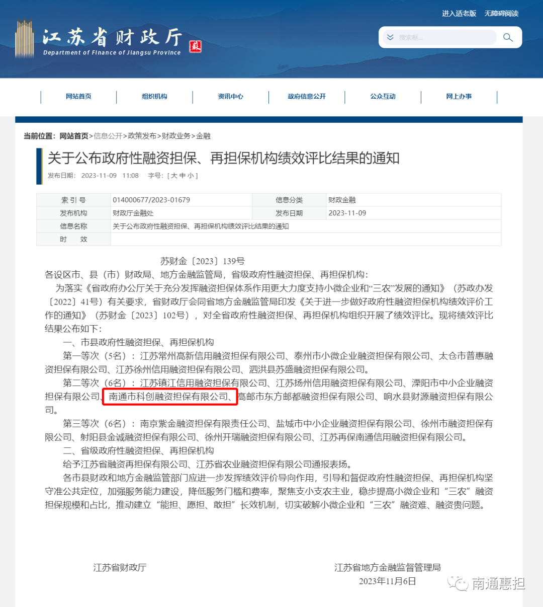 11月9日,全省政府性融資擔保機構績效評比結果正式發布,全省共有17家市縣政府性融資擔保、再擔保機構上榜。其中,南通市科創融資擔保有限公司位列前十。