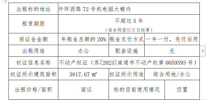 南通國泰創(chuàng)業(yè)投資有限公司所托管園區(qū)外環(huán)西路72號機電園,已由南通三玖企業(yè)管理服務(wù)有限公司中標(biāo)負(fù)責(zé)整體招商運營管理,擬打造成“產(chǎn)業(yè)研發(fā)、辦公及配套商業(yè)”的總體格局,即日起公開對外招租。 一、出租標(biāo)的信息
