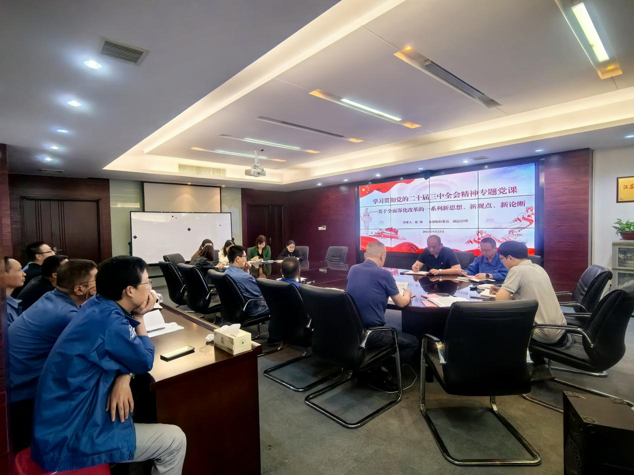 公司支部組織委員、副總經理徐翔結合學習貫徹黨的二十屆三中全會精神的有關工作要求,為全體黨員講授了一堂題為《黨的二十屆三中全會中關于全面深化改革的一系列新思想、新觀點、新論斷》的專題黨課。黨課從十個方面深入淺出地解讀了關于黨中央全面推進深化改革的重大現實意義和深遠歷史意義。